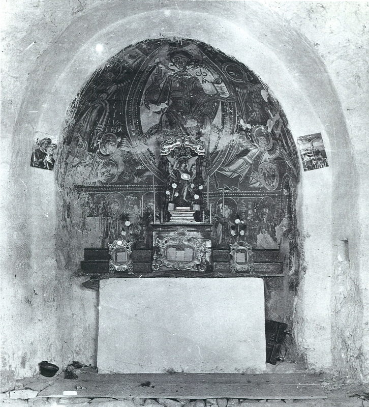 La part inferior del mur de l’absis es troba completament malmesa i no hi és visible cap vestigi de decoració; és possible que, com en d’altres conjunts, fos decorada amb un tema de cortinatges figurats.