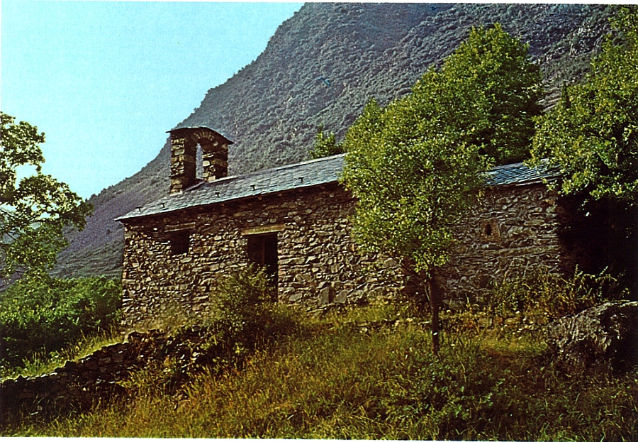 Una vista de l’exterior de l’església des de migjorn. És un edifici del segle X, una mica posterior al de Sant Vicenç d’Enclar i al de Santa Coloma. D’esquerra a dreta hi és visible el cos d’edifici identificable amb un pòrtic cobert i un cor, la nau i la capçalera, trapezial, a llevant.