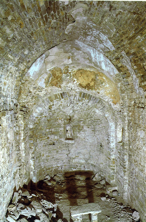 Detall d’un dels murs interiors de l’església, en el qual hom pot veure un aparell d’opus spicatum.