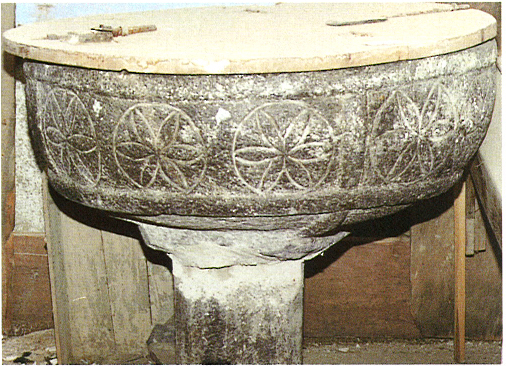 Pica baptismal guardada a l’interior de l’església que mostra una ornamentació de caràcter geomètric.