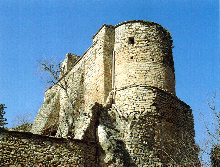 Aspecte de l’església, bastida sobre un alt sòcol, convertida avui dia en local social del poble de Montsonís.