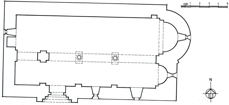 Planta de l’església, singular edifici de dues naus, separades per un pilar cruciforme i dues columnes monolítiques.