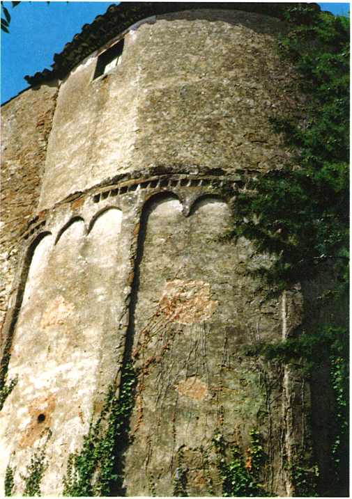 Vista exterior del mur de l’absis, amb decoració d’arcuacions, disposades en grups de tres per lesenes i amb un fris de dents de serra que en corona la part superior.
