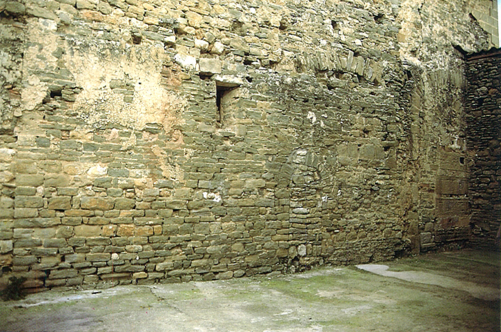 Mur de migdia de l’antiga església prioral, on encara és visible la primitiva porta que donava accés a les dependències monacals i algunes sepultures d’època gòtica encastades en el parament del mur que tanca el transsepte.