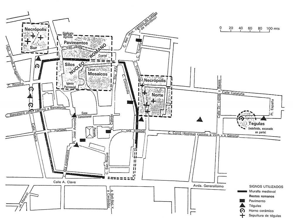 Nucli històric i medieval sobreposat a una antiga estructura romana (plànol segons J. Estradé i Garriga, a Síntesis Arqueològica de Granollers, Granollers, 1955, 2a. ed., pàg. 23).