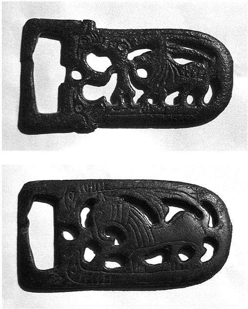 Placa de cinturó liriforme procedent d’una sepultura del cementiri de la Neàpolis d’Empúries i placa de cinturó del mateix tipus trobada a Puig Rom.