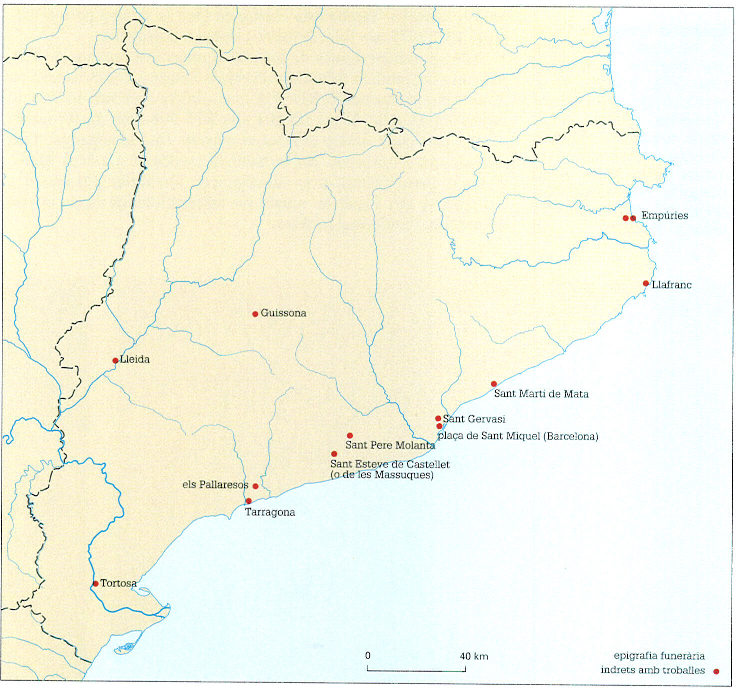 La major part d’inscripcions funeràries d’època tardana trobades a Catalunya provenen de la província de Tarragona i, molt especialment, de les excavacions realitzades durant els anys vint a la necròpoli paleocristiana de Tàrraco, on s’han pogut documentar més d’un centenar d’epitafis. El nombre d’inscripcions de caràcter funerari trobades en altres comarques catalanes és molt inferior, i es redueix a cinc peces de les comarques de Barcelona (IRC I, 6; IRC I, 13; IRC I, 14; IRC I, 123; IRC I, 163) dues de les de Girona (IRC III, 164 i IRC III. 187) i dues de les de Lleida (IRC II, 10 i IRC II, 82)(*). Gran part d’inscripcions s’han documentat en necròpolis urbanes com les de Tàrraco, Empòrion (IRC III, 164), Ilerda (IRC II, 10) i lesso (IRC II, 82). També hi ha exemplars originaris de cementiris rurals, com la inscripció de Llafranc (IRC III. 187), de vegades vinculats a un edifici de culte com l’ermita de Sant Martí de Mata (Mataró) (IRC I, 123). D’altres inscripcions en desconeixem el context, com la descoberta a Sant Esteve de Castellet, a l’Alt Penedès (IRC I, 6); la placa trobada i conservada a Can Xic Ferrer (Sant Pere de Molanta, Alt Penedès) (IRC I, 13), o la inscripció que va aparèixer el 1891 o el 1892 en un terreny del carrer de Puig, de l’antic poble de Sant Gervasi de Cassoles (Barcelona) (IRC I, 163), en relació probablement amb un establiment dedicat a l’explotació agrícola.
