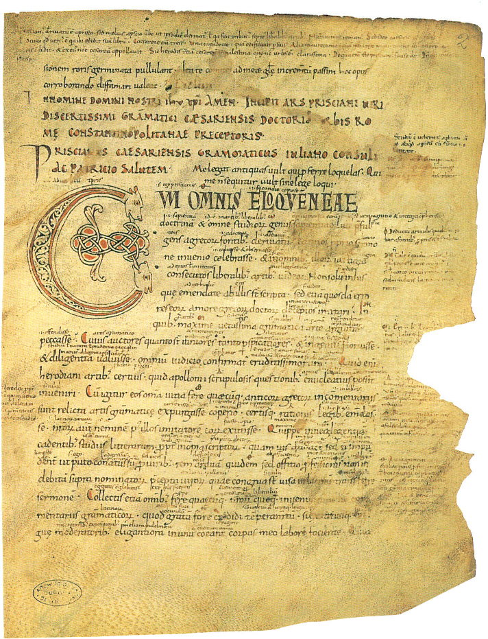 Foli 2 de la Gramàtica de Priscià, manuscrit copiat al darrer quart del segle X, segurament a l’escriptori de Ripoll (ACA, ms. Ripoll 59).