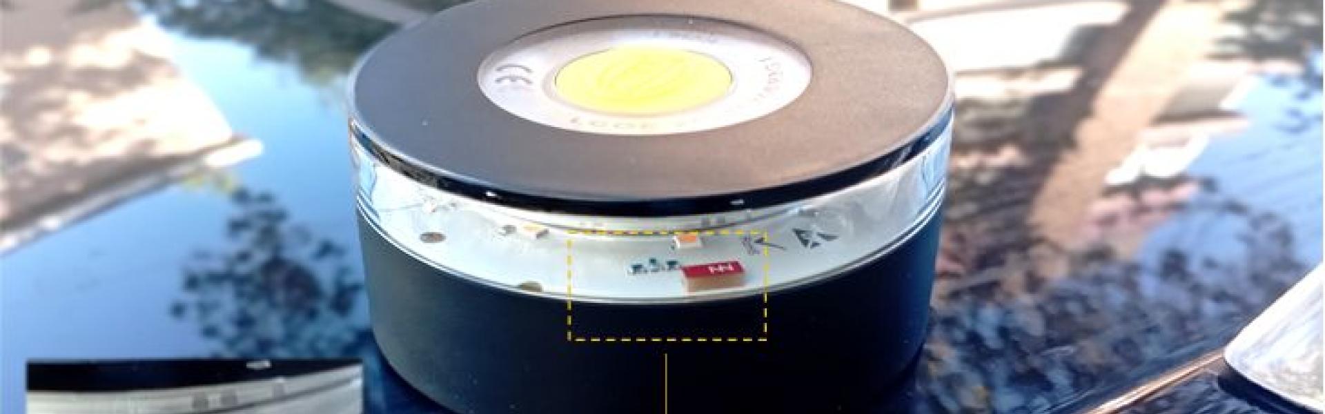 Fig. 17 Representació d'un dispositiu de llanterna amb connectivitat sense fils, dissenyat per a adherir-se de manera segura al sostre d'un vehicle mitjançant un sistema de fixació magnètica. El dispositiu incorpora un botó superior de color groc, fàcilment identificable, que activa un senyal lluminós intermitent visible a una distància de fins a 1 quilòmetre. Integra Virtual Antenna® Technology amb dos antenna boosters: un destinat a garantir la connectivitat cel·lular i un altre optimitzat per a la recepció precisa de senyals GPS [14]