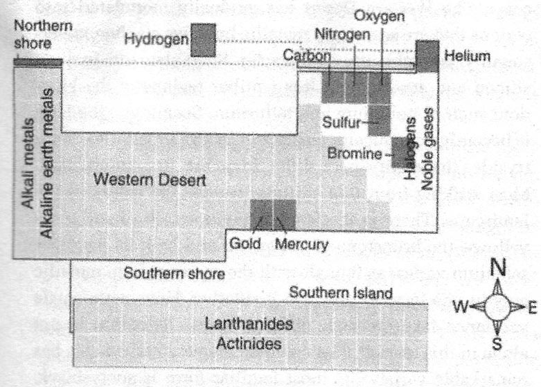 El llibre té tres parts: Geografia, Història i Govern, i Institucions. A la primera part parla del terreny, dels productes de les regions i de geografia física. El terreny és la descripció física de la taula periòdica, en la línia analògica indicada al primer paràgraf (figura 2). Els productes són les substàncies elementals, com poden ser els metalls o el sofre. Pateix una mica per mantenir l'analogia, perquè a les regions que són gasoses, com l'oxigen, no acaba de veure's clar si és una regió on hi ha gas, o tota ella és feta de gas. I pel que fa a geografia física, presenta a cada casella la seva alçària representada per la seva massa atòmica (figura 3). Així, el reialme és més baix al nord i a l'est, mentre que té més alçària al sud i a l'oest. Naturalment, hi ha altres propietats que es podrien representar també "orogràficament" i donarien una perspectiva del terreny molt diferent. L'autor no vol situar l'hidrogen ni al grup 1 ni al 17, i el deixa com a illa al nord del regne.