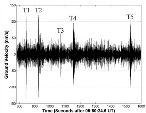 Identificació en un sismograma de diversos moments de la trajectòria d’un meteor (Brown et al., 2004)