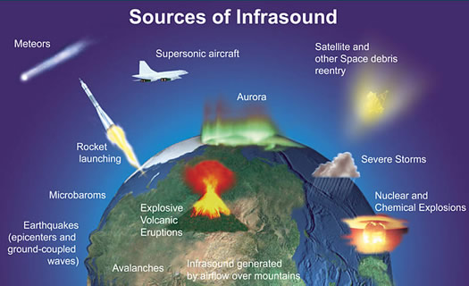 Hi ha fenòmens que són naturals i en generen, com ara les allaus, volcans, terratrèmols, ones oceàniques, salts d’aigua i evidentment els protagonistes d’aquest apunt, meteors i meteorits. Tanmateix també hi ha fenòmens artificials que produeixen ones infrasòniques, per exemple les explosions nuclears i químiques, la maquinària industrial i els avions.