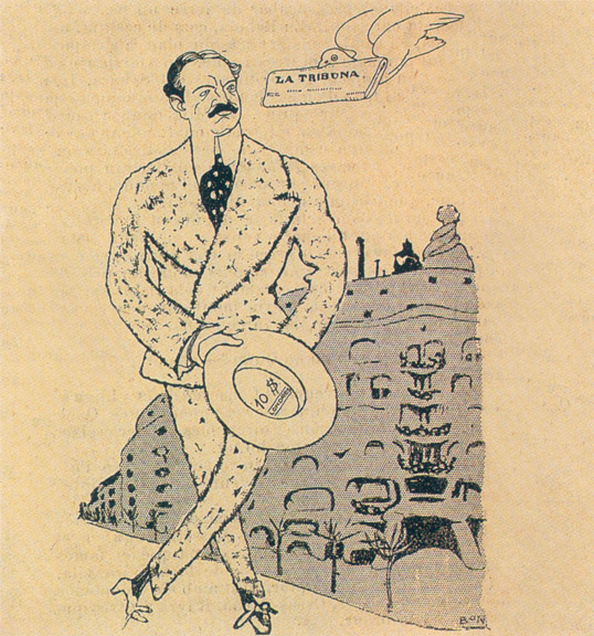 Romà Bonet («Bon») (1886-1967): Caricatura de Perico Milà i Camps, a El Gall (1912), davant de la seva casa de La Pedrera.