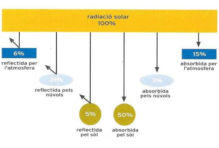 Balanç global de radiació solar. La terra i els oceans absorbeixen si fa no fa la meitat de la radiació solar que travessa les capes altes de l’atmosfera. Un 32 per cent és reflectit per l’atmosfera, els núvols i el sòl. Fins a una altura d’uns 150 km, l’espectre de radiació és el mateix que el de la llum solar. Cap als 85 km l’absorció de raigs X és completa. A l’estratosfera, la radiació ultraviolada és absorbida per la capa d’ozó. L’energia absorbida retornarà més tard a l’espai com a radiació infraroja.