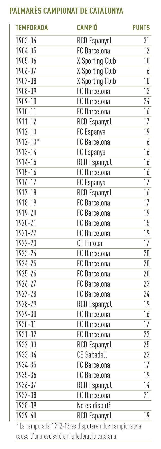 La temporada 1939-40 l’Espanyol s’adjudicà el darrer Campionat de Catalunya i es proclamà campió de Copa. El conjunt espanyolista també disputà la final de l’any següent, en què fou derrotat pel València, i el 1942 el Barcelona guanyà el títol. Una setmana més tard els barcelonistes s’imposaven al Múrcia en un partit de promoció per evitar el descens a segona divisió. Una promoció en què també participà, sense èxit, el Sabadell, campió de la categoria d’argent aquella temporada.
