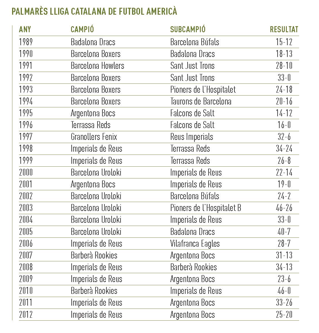 Els equips catalans han dominat clarament la Lliga espanyola. Els clubs més premiats han estat els Dracs, que han guanyat en cinc ocasions, i els Pioners, triomfadors en quatre edicions, incloent-hi les dues darreres. Els actuals campions de la Lliga Catalana són els Imperials de Reus, que s’imposaren als Argentona Bocs en les dues últimes finals (2011, 2012).