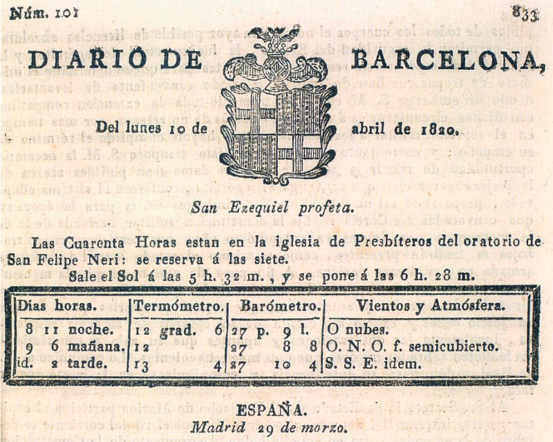 Capçalera del Diario de Barcelona. Antoni Brusi i Mirabent establirà el 1820 el primer taller litogràfic que hi hagué a l’estat. Era l’editor del Diario de Barcelona.