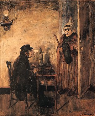 Rebé influències de l’impressionisme i de la pintura nabí. Vers el 1879 començà un expressionisme propi, d’arrel profundament flamenca, que culminà en l'Entrada de Crist a Brussel·les (1889, museu d’Anvers). A partir d’aquesta obra derivà vers una pintura d’escenes tumultuoses i extravagants, en la qual es barregen formes acolorides i amuntegades i figuren retrats de personatges de la societat contemporània barrejats amb esquelets i màscares: La vella de les màscares (1889, col·lecció particular), Crist apaivaga la tempesta (1891, museu Ensor, Oostende), etc. Pintà també natures mortes i escenes d’interiors burgesos, tot fent gala d’una punyent caricatura relacionable amb la del Bosch, però més romàntica i ferotge. Féu sèries de gravats (1860-89 i 1896-99) i participà en la fundació del Cercle dels XX i, quan aquest es dissolgué, en la de La Libre Esthétique (1893), on exposà periòdicament la seva obra, sempre discutida, car, a partir del 1895, l’autor començà a copiar-se; la seva producció començà a ésser apreciada per burgesos i autoritats.