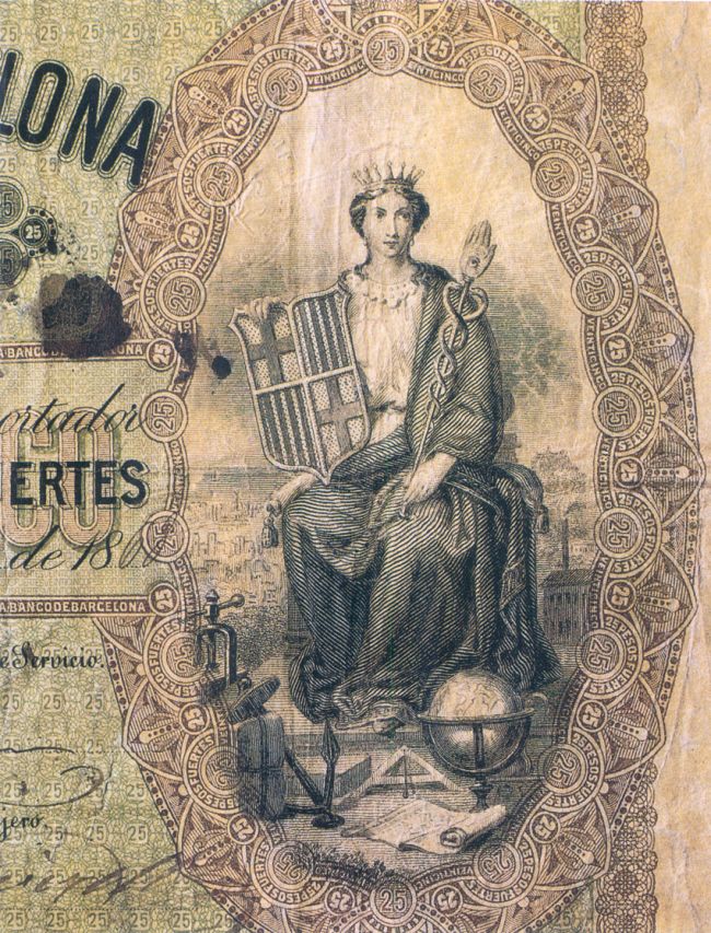 Figura representativa de Barcelona i del comerç en un dels bitllets del Banc de Barcelona, 1868.