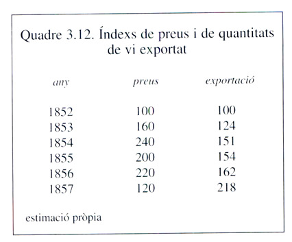 Quadre 3.12. Índexs de preus i de quantitats de vi exportat, 1852-1857.