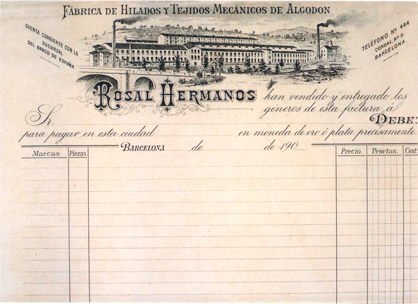 Factures de les fàbriques de teixits de cotó i estampats Ignasi Vidal i Rosal Germans. Per a foragitar els competidors europeus, els fabricants catalans es van mostrar inflexibles en la preservació del pacte que des dels primers anys 1820 els unia als bladers espanyols en demanar la prohibició o restricció de les importacions. Els cotons catalans s’expandeixen terra endins a costa dels teixits de lli i cànem espanyols
