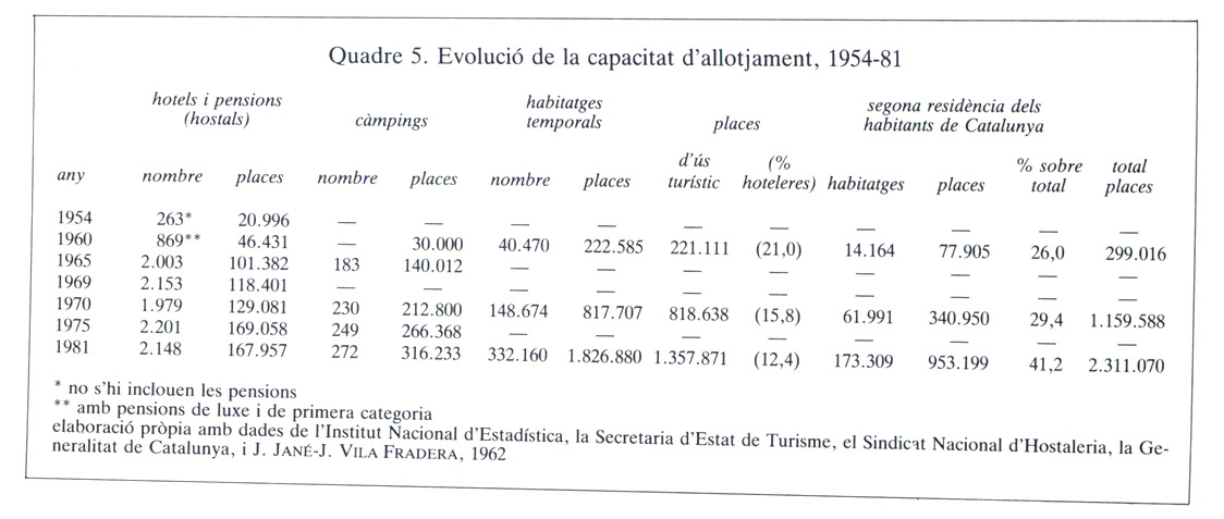 Al quadre 5 hom pot veure que la capacitat total d’allotjament passà de 299.016 places el 1960 a 1.159.588 el 1970. La segona residència dels habitants de Catalunya passà del 26% al 29,4% de la capacitat total. Per la seva banda, les places d’ús turístic passaren de 221.111 el 1960 a 818.638 el 1970; la participació de l’oferta hotelera disminuí progressivament, de manera que si el 1960 era del 21%, el 1970 havia baixat al 15,8% (disminució una mica més accentuada, a causa de la reclassificació administrativa).