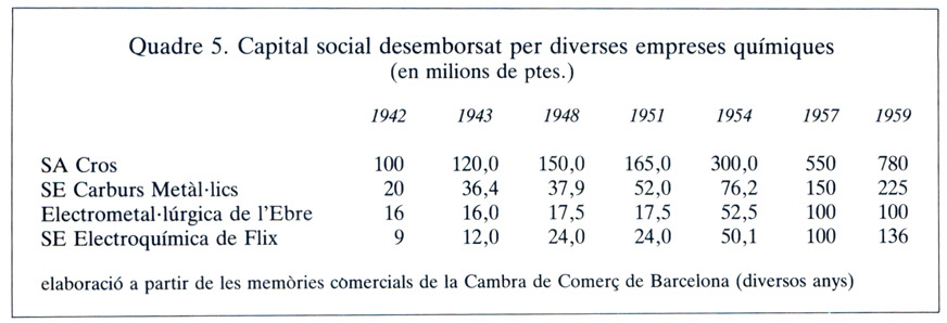Quadre 5. Capital social desemborsat per diverses empreses químiques, 1942-1959.