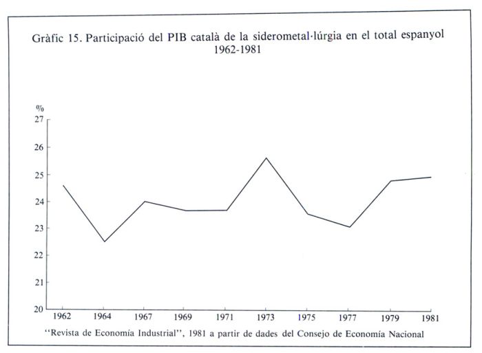 Així, sembla constatar-se un comportament prou específic d’aquest sector i dissonant del que manté el conjunt industrial, atès que si el creixement del PIB del sector en el període 1962-73 es fonamenta bàsicament en els augments de la productivitat, en el període 1973-81 ho fa en l’augment de la població ocupada en el sector.