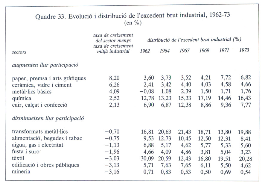 Així, per al conjunt de la indústria catalana, mentre es constata una lleugera disminució de la taxa d’excedent en el període 1960-67 i una certa recuperació en el període 1967-73, en el si dels sectors industrials s’havia produït una transformació acusada que incidí desigualment en la capacitat d’extracció de l’excedent brut industrial. En aquest sentit, pel que fa al període 1962-73, es constata que mentre el de metàl·lics bàsics és dels que palesen un creixement del seu excedent brut superior a l’industrial, el de transformats metàl·lics fou inferior, encara que molt proper al del conjunt industrial.