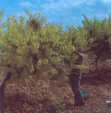 Contràriament, pel que fa als arbres fruiters, llur conjuntura econòmica fou, com hem dit, de les més expansives del període que observem23. Efectivament, després d’una primera caiguda dels preus els anys de la Primera Guerra Mundial, de resultes possiblement de l’elevat encariment dels aliments de primera necessitat, les cotitzacions de la fruita observaren posteriorment una revalorització que les situà el 1933 molt per sobre de les que hi havia abans del conflicte armat del 1914. Amb relació al 1910, els preus dels préssecs, per exemple, s’havien incrementat (sempre en pessetes constants) en un 65%, els de les peres en un 85%, els de les pomes en un 75% i els de les avellanes en un 37%, i en canvi es mantenien a uns nivells similars els de les ametlles i les garrofes24. No és, doncs, estrany que l’augment de les superfícies en plantació regular tingués lloc, més acusadament, a partir de la dècada del 1920, però si aquest fou remarcable, puix que se situà en el 20% entre el 1922 i el 1933, ho fou més encara l’atribuïble al nombre total d’arbres en producció, que, en aquelles mateixes dates, se situà en el 39%, passant de 8.719.261 a 12.111.017. D’aquest procés de creixement, però, cal destacar dos fets. En primer lloc, als tradicionals aprofitaments d’avellaners i ametllers, característics els primers del Camp, la Selva i el Vallès, i els segons del Baix Ebre, Terra Alta, el Camp, el Penedès, les Garrigues i el Baix Urgell, s’afegí ara l’expansió dels fruiters de fruita fresca, com els presseguers, que donaren lloc a una exportació considerable i iniciaren, així, un intens desenvolupament ràpidament interromput, però, el 193625 per l’inici de la guerra. Alhora, cal també destacar l’evolució dels garrofers, un dels conreus arboris que més cresqué i que passà d’ocupar en plantació regular 42.470 ha el 1910, a ocupar-ne 59.871 el 1933, a càrrec, principalment, dels pocs rendibles boscos. Si considerem, a més, que el producte d’aquest arbre —”En las regiones catalanas y valencianas, constituye la parte más importante del pienso de las caballerías [...]”—26, és clar que la seva expansió cal situar-la en el marc més general de les reorientacions productives que s’han anat esmentant.