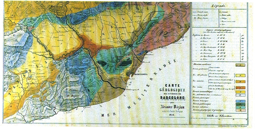 La tesi de Vézian (1856) és una de les primeres descripcions dels terrenys propers a Barcelona. Conté un mapa a una escala aproximada d’1: 180 000, que reproduïm a la figura, en el qual es distingeixen força bé els principals trets de la distribució dels terrenys geològics d’aquesta regió.