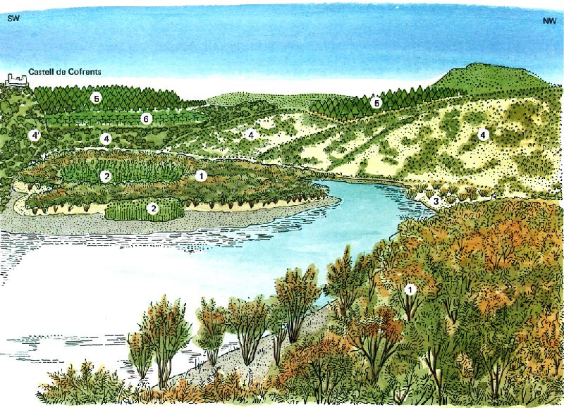 Panoràmica esquematitzada de la vall del Cabriel (Vall de Cofrents), a Cofrents, 400 m: 1 tamarigar, 2 canyissar, 3 baladrar, 4 brolla de romaní i maleïda amb trincola, o (4’) amb espart, 5 pineda de pi blanc, 6 olivet.