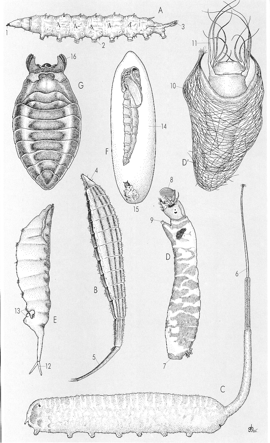 Larves i pupes de dípters aquàtics: A larva d’aterícid (Atherix), amb el cap petit i retràctil (1), pseudopodis (2) i lòbuls terminals (3) al voltant de l’espiracle, que viu típicament a les molses dels torrents de muntanya. B larva d’un estratiómid (Stratiomys), amb el cap típicament hemicèfal (4) i proveïda d’un llarg sifó (5) que li permet respirar aire atmosfèric des dels tolls rics en materials orgànics on viu. C larva del sírfid Eristalis, anomenada cuc cua de rata, amb el seu llarguíssim sifó telescopitzable (6), que li permet viure a una certa fondària en aigües molt contaminades i sense oxigen. D larva d’un simúlid (Simulium), que s’adhereix a les pedres dels torrents de fort corrent per mitjà d’un disc terminal (7), i al cap de la qual veiem la premandíbula (8) en forma de ventall amb la qual filtra l’aliment, alhora que al tòrax s’hi distingeix un pseudopodi dotat d’espinetes (9). D’ pupa de simúlid, amb l’estoig sedós (10) que la fixa al substrat i els corns toràcics filamentosos (11) que formen el plastró per on respira. E pupa d’un efídrid (Ephydra), en la qual s’observa el sifó dividit de la part final del cos (12) i l’estructura del final de l’abdomen (13), gràcies a la qual resta fixada al substrat en aigües somes, especialment en les salines. F pupa de quironòmid (Orthocladius), amb la càpsula gelatinosa (14) que la manté unida a la part superior de les pedres, en torrents i rius de corrent fort; s’observa també l’exúvia (15) de la larva, abandonada dins de la càpsula. G pupa de blefaricèrid (Liponeura), la forma plana de la qual li permet viure en llocs d’aigua de corrent fort; hi són visibles els corns respiratoris (16).