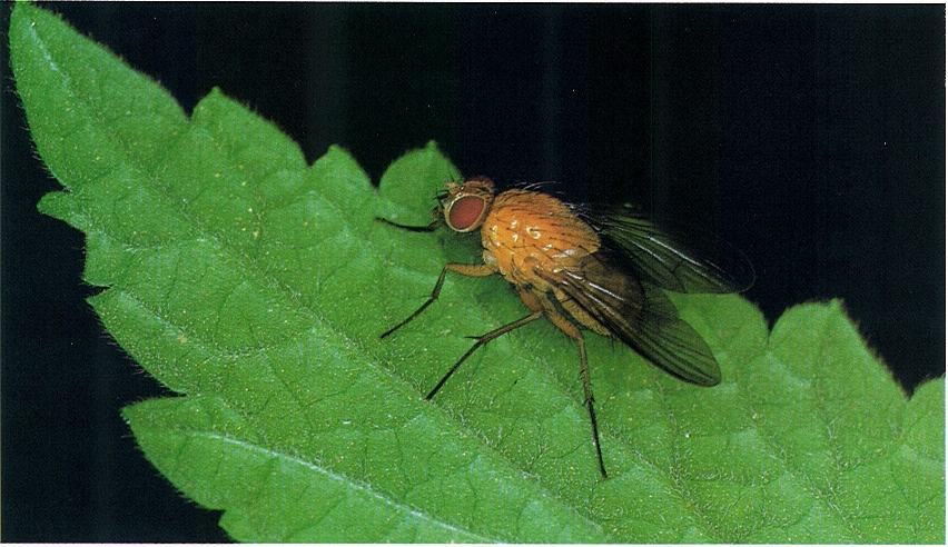 Mosca de la carn (de la família dels sarcofàgids). Les seves larves poden desenvoluparse en materials en descomposició molt ràpidament gràcies al fet, peculiar, de l’ovoviviparisme, que fa que les larves neixin dels ous, dins les vies genitals de la mosca mare, de manera que no hi ha una posta típica.