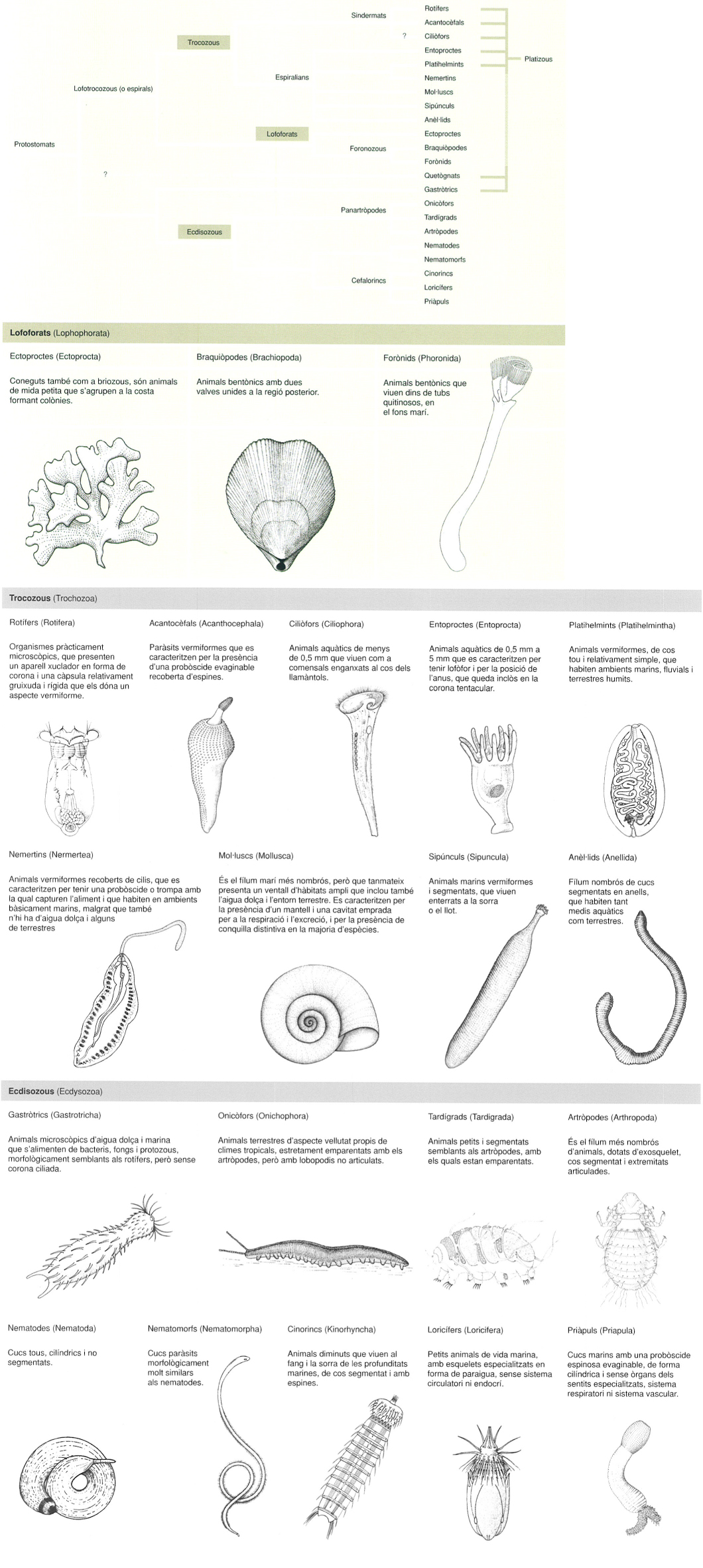 Arbre filogenètic dels protostomats i les característiques principals dels clades destacats amb un requadre. Els dibuixos no són a escala.