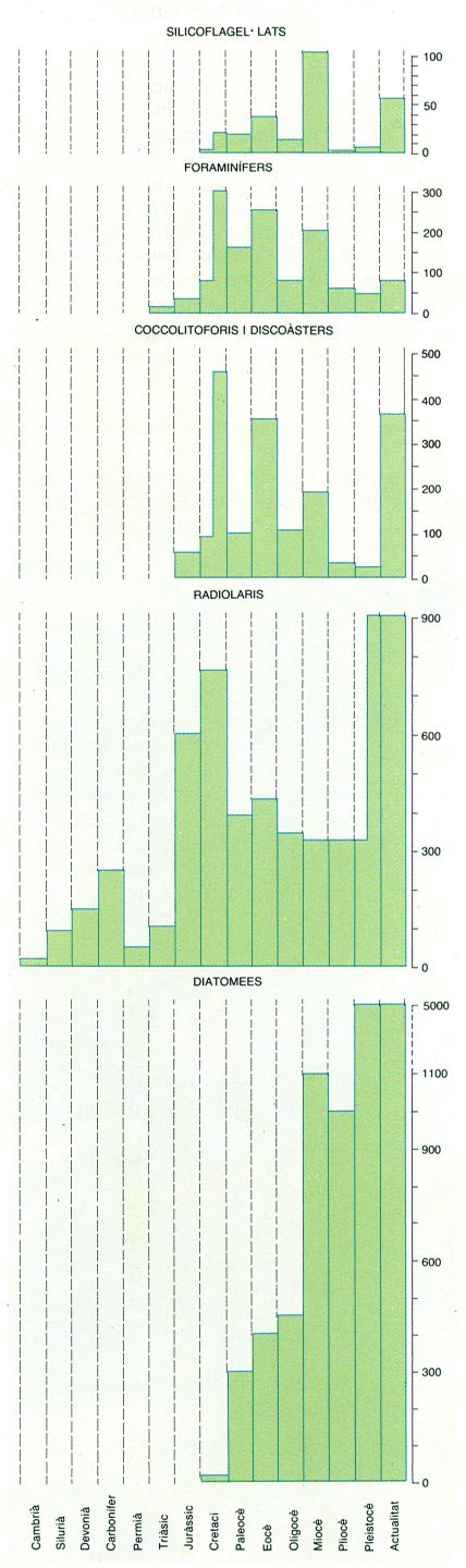 Evolució del nombre d’espècies de diversos grups d’organismes planctònics en els oceans del passat. Hom aprecia en el dibuix, a més, el moment d’aparició de cadascun en el decurs dels temps geològics.