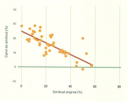 Homogeneïtzació biòtica dels peixos continentals a la península Ibèrica el 2001 respecte a la situació original. La figura mostra com la fauna de peixos actual és cada vegada més similar a la gran majoria de conques ibèriques amb relació a la distribució original. Cada punt mostra una similitud entre parells de conques; els punts situats per sota del zero indiquen que la similitud ha disminuït perquè les conques s’han diferenciat.