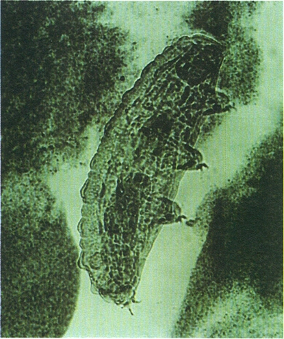 Aspecte general d’un tardígrad (Echiniscus, × 500), en el qual destaquen les expansions filiformes de les plaques dorsals que caracteritzen el gènere.