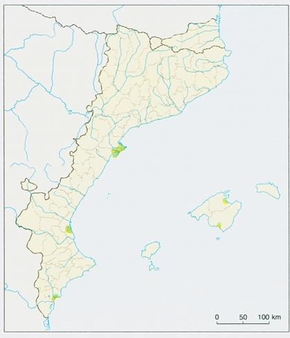 A l’hivern es pot trobar d’una forma irregular i en poca quantitat a la major part dels marjals del litoral, des del Rosselló fins al País Valencià, i també a les Illes. Malgrat això, només és regular i relativament comuna al delta de l’Ebre (mitjana de 586 exemplars per als mesos de gener de 1977-85; màxima de 750 el 1977), les salines de Santa Pola (màxima de 52 exemplars el gener de 1978), el salobrar de Campos a Mallorca i les salines d’Eivissa (màxima de 84 exemplars el gener de 1984).