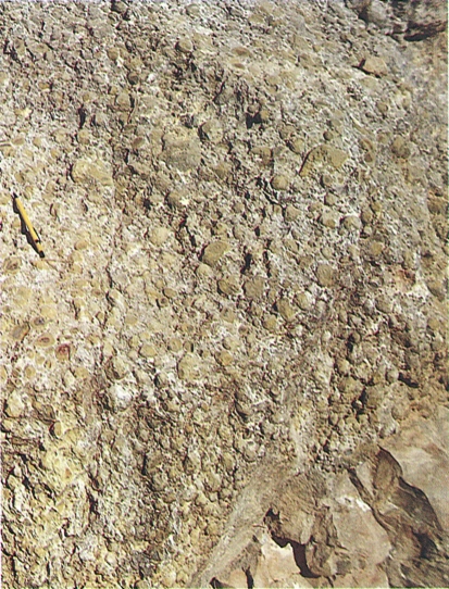 Nivell de pisoides de «caliche» (concrecions concèntriques d’origen pedològic i aspecte de còdol) de la base de la successió paleògena inferior d’Estenas, a la serra d’Utiel.