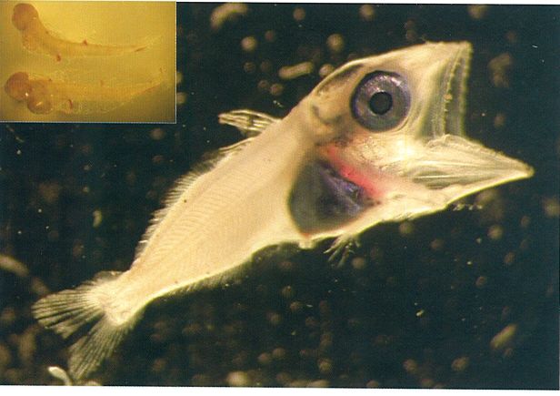 Larves de tonyina: exemplar acabat d’eclosionar, de poc més de 2 mm de longitud (a dalt) i exemplar de quasi dues setmanes d’edat (a baix), d’uns 7 mm.