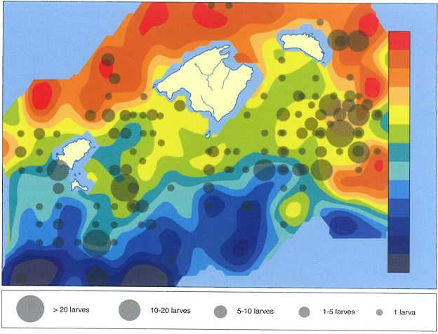 Composició de l’escenari hidrogràfic estival a les aigües superficials de la mar Balear durant el període 2001-05, i dades quantitatives de distribució de larves de tonyina. Les aigües representades en blau provenen directament de l’Atlàntic, mentre que a l’altre extrem, les representades en vermell ja tenen característiques de salinitat pròpies de la Mediterrània.