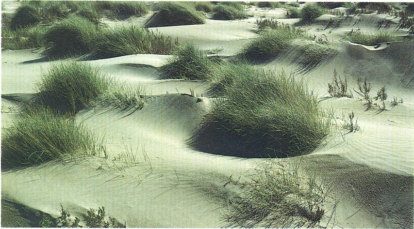 L’estructura zonal és una de les principals característiques de l’ecosistema dunar i, al mateix temps, és una conseqüència del procés de sedimentació de la sorra, de les possibilitats de colonització del substrat per les plantes i dels gradients de variació dels factors segons la proximitat de la línia de costa. La fotografia, presa a la zona de Guardamar (Baix Vinalopó), permet distingir aquesta estructura. Les dunes de Guardamar, formades a la plana deltaica del Segura, foren fixades artificialment per mitjà de la plantació de pins, eucaliptus i palmeres.