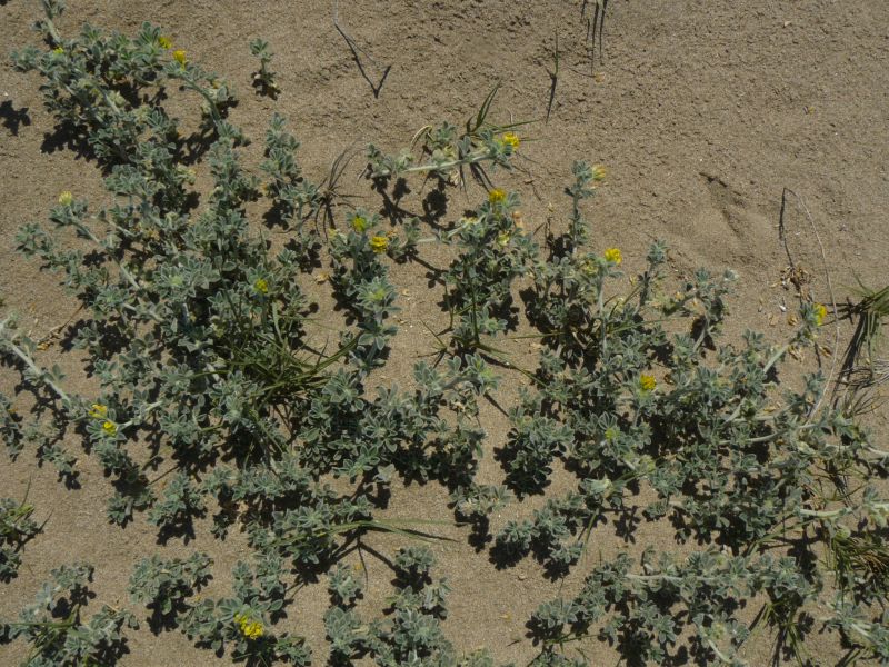 Melgó marí (Medicago marina) recobert per la sorra al delta de l’Ebre, situació a la qual sovint estan exposades les plantes psammòfiles; solen respondre-hi amb un increment de la taxa de creixement.