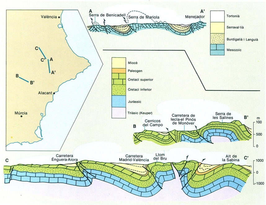 Talls geològics del Prebètic del migjorn valencià. A dalt, tall corresponent a la zona d’Alcoi, amb plecs concèntrics de gran radi i bona continuïtat lateral, tallats per petits encavalcaments situats al flanc NW. Al mig, tall corresponent a la zona de la serra de les Salines, a l’extrem occidental de la serra d’Alcoi. A baix, tall corresponent a la zona entre Canals i Mogent (zona septentrional), on s’aprecia l’anticlinal amb doble vergència i forma «en cofre», i els encavalcaments dirigits tant cap al NW com cap al SE.