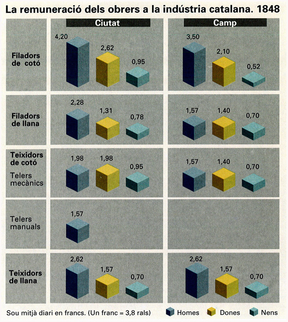 Les dades recollides el 1848 per Ferdinand-Marie de Lesseps, cònsol de França a Catalunya, encara que molt incompletes, mostren els ingressos desiguals que rebien els treballadors catalans.