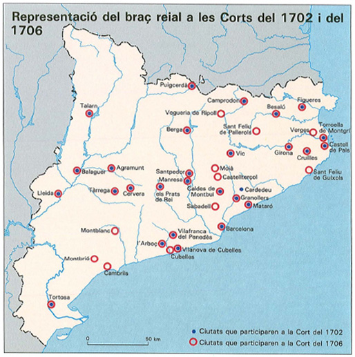 Es va produir un reforçament en el braç reial, amb l’augment del nombre de ciutats amb dret de participar-hi, que responia, així mateix, a la necessitat de la monarquia d’augmentar la base social que li podia donar suport. Tot i així, es fa difícil identificar d’una manera clara les poblacions que pertanyien a un i altre bàndol, a causa de la indecisió que va caracteritzar les actituds dels consells municipals durant el conflicte. El 1702 hi participaren Barcelona, Lleida, Girona, Tortosa, Vic, Cervera, Manresa, Balaguer, Vilafranca del Penedès, Puigcerdà, Tàrrega, Berga, Granollers, Mataró, Camprodon, Besalú, Prats del Rei, Vilanova de Cubelles, Castell de Pals, Torroella de Montgrí, l’Arboç, Caldes de Montbui, Figueres, Talarn, Cruïlles, Santpedor, Cardedeu i Agramunt. Quatre anys més tard, a més d’aquestes ciutats —a excepció de Cardedeu, el síndic de la qual no va ser habilitat— foren acceptades Sabadell, Moià, Sant Feliu de Pallarols i Vall d’Hostals, Castellterçol, Verges, Sant Feliu de Guíxols, Cambrils, Cubelles, Montblanc, Montbrió i la vegueria de Ripoll.