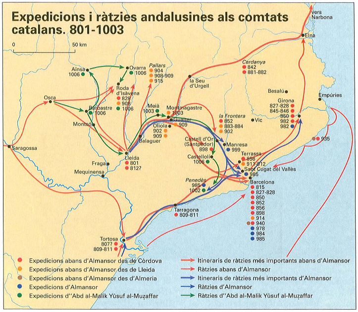Fou en aquest context que començaren les ràtzies del cabdill (ḥaǧib) Al-mansor. La primera expedició tingué lloc contra el comtat de Barcelona l’any 978. Després vingueren la de Girona (982) i novament a la regió de Barcelona (984). La següent expedició, un any després, esdevingué famosa. Derrotades les tropes del comte Borrell, Almansor arribà fins als murs de Barcelona l’I de juliol de 985 mentre que un esquadró sarraí prenia posició a la platja. La ciutat fou assetjada i assaltada dies després, el dilluns 6 de juliol de 985. Els textos llatins que relaten aquest episodi diuen que els seus defensors foren en part exterminats, en part reduïts a captivitat i conduïts com esclaus cap a terres sarraïnes. Barcelona i els monestirs de Sant Pere de les Puelles i de Sant Cugat del Vallès foren saquejats i cremats. L’any 999 tingué lloc una nova campanya, aquesta vegada dirigida vers el Penedès i la regió al voltant del riu Llobregat, que finalitzà amb la destrucció de Manresa.