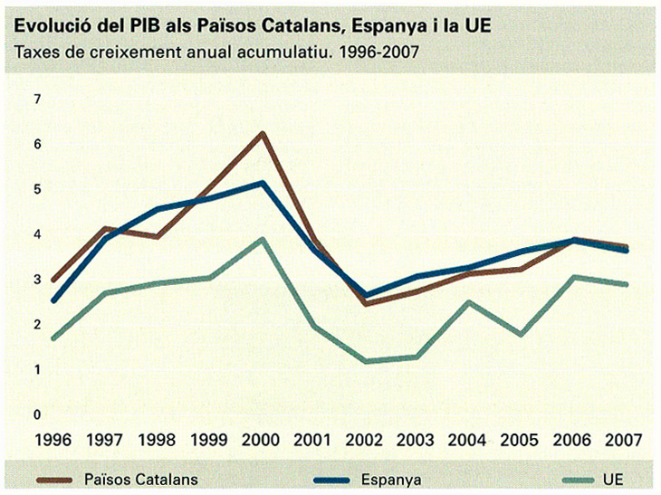 La taula que presenta la taxa de creixement acumulatiu anual del PIB real en termes absoluts i per capita per al període 1996-2006 fa saber que tot el període ha estat caracteritzat per un creixement econòmic continuat i relativament modest, encara que bastant més consistent que el d’altres països de la UE. El creixement del PIB ha estat més intens a les Illes Balears i al País Valencià, mentre que Catalunya quedava per sota del conjunt espanyol. Cal recordar que el saldo fiscal negatiu de Catalunya redueix substancialment el seu PIB a benefici de la resta d’Espanya, mentre que altres comunitats autònomes espanyoles incrementen de manera molt important el PIB directament per les aportacions de fons procedents de la UE. L’efecte de minva del PIB per causa de les transferències, a través de l’Estat central, cap a les altres regions espanyoles és també present a les Illes Balears i al País Valencià, però amb menys intensitat. En termes per capita, tots els membres dels Països Catalans resten clarament per sota de la mitjana espanyola.