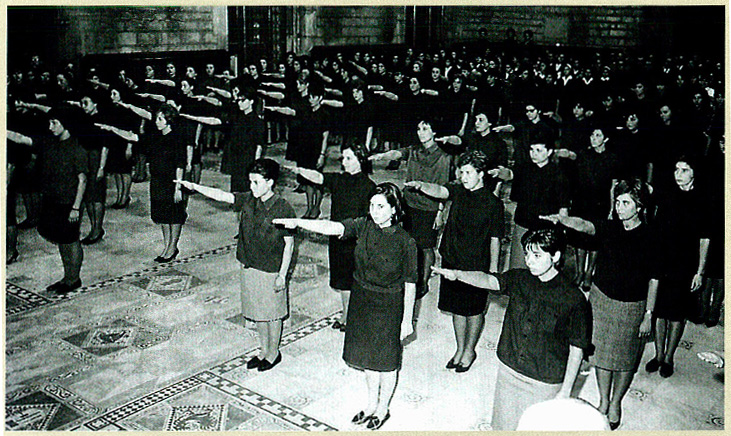 Jurament de pas a l’edat adulta d’un grup de membres de la Sección Femenina de Barcelona al Saló de Cent de l’Ajuntament, C. Pérez de Rozas, 29-10-1962.